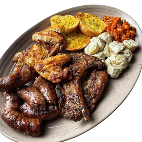 A hearty selection of meats — sausage, pork, and chicken — grilled to perfection and served with fresh, toasted garlic bread.